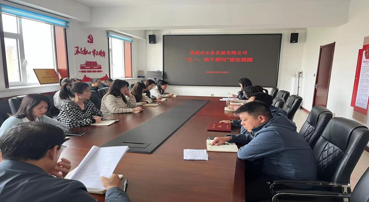 2023年五一、端午將至,為落實(shí)中央紀委國家監委和省紀委監委有關(guān)要求,切實(shí)做好五一、端午節日期間落實(shí)中央八項規定精神、糾“四風(fēng)”樹(shù)新風(fēng)工作,4月28日,晉城市水務(wù)發(fā)展有限公司組織全體干部職工召開(kāi)“五一、端午期間”廉潔提醒談話(huà),會(huì )議由公司黨支部書(shū)記、董事長(cháng)潘軍主持。